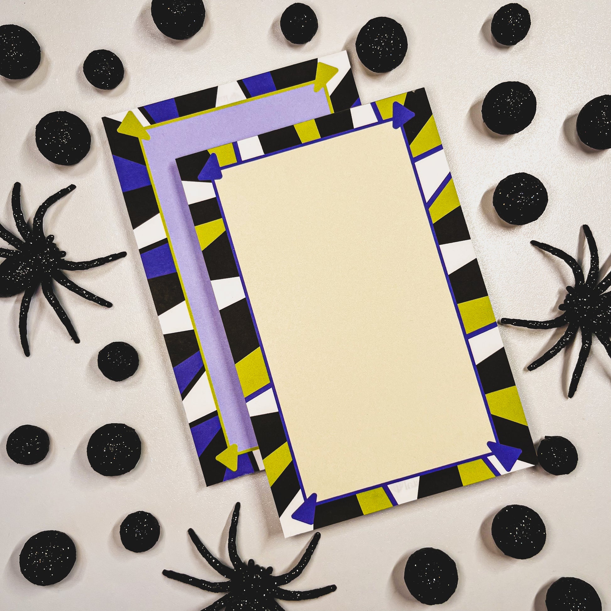 Funky meets Fright Night with this Beetlejuice inspired Eco-Friendly Halloween Notepad featuring bold stripes in white, green, and purple β perfect for haunted plans, monster to-dos, and keeping your Halloween stylishly spooky!