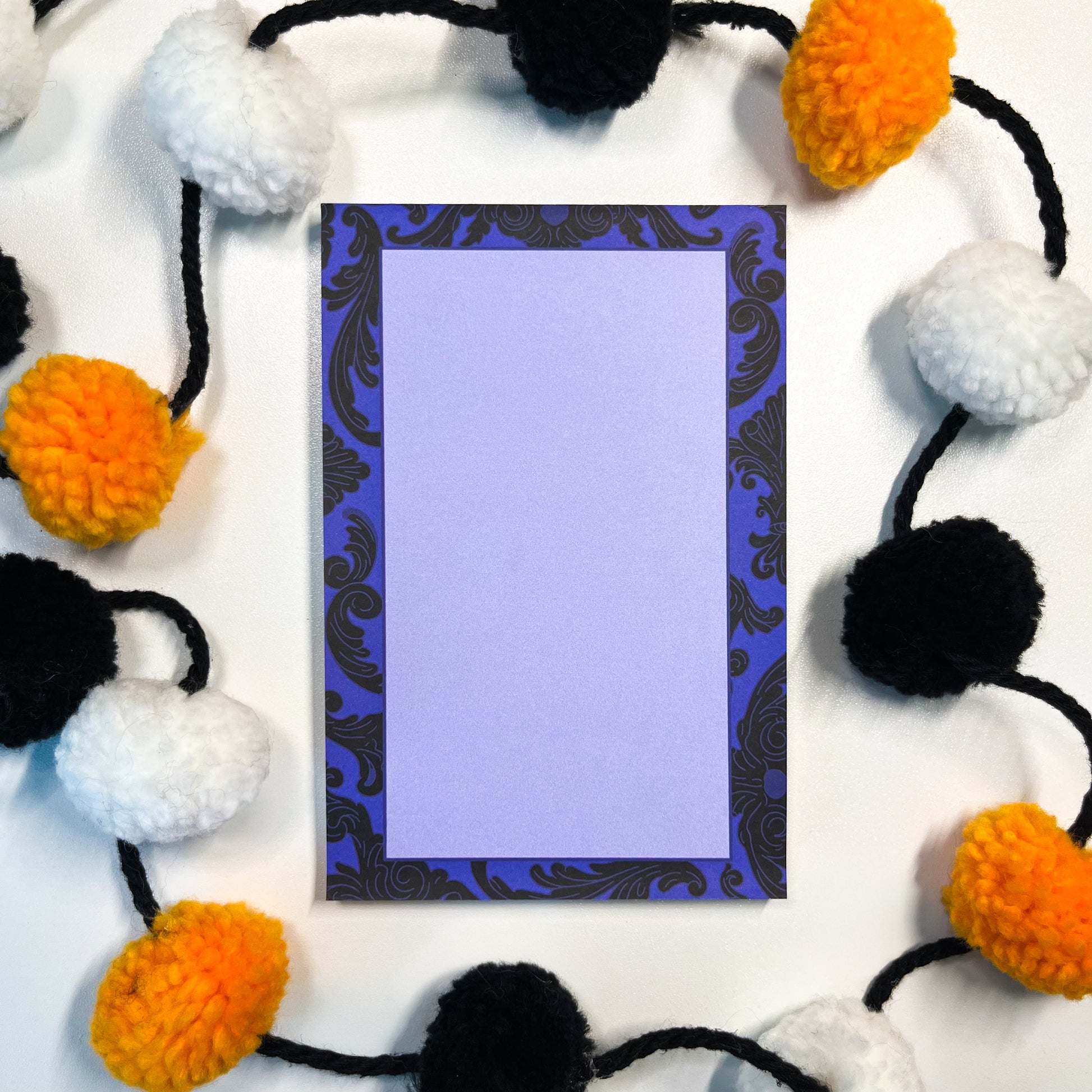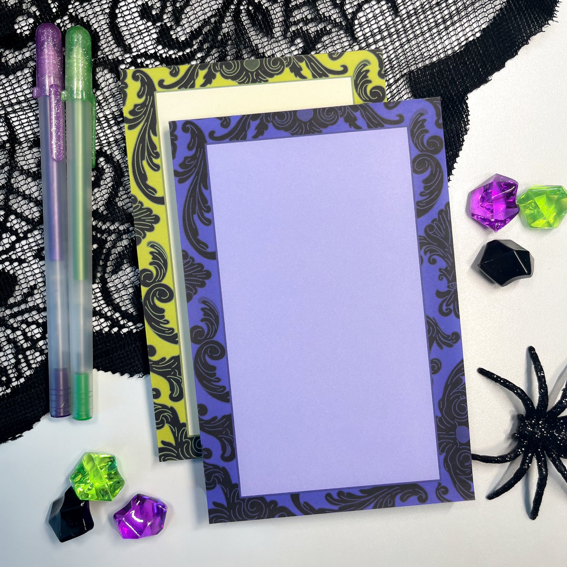 Funky meets Victorian Gothic with this Beetlejuice inspired Eco-Friendly Halloween Notepad featuring green or purple behind black filigree — perfect for haunted plans, monster to-dos, and keeping your Halloween stylishly spooky!